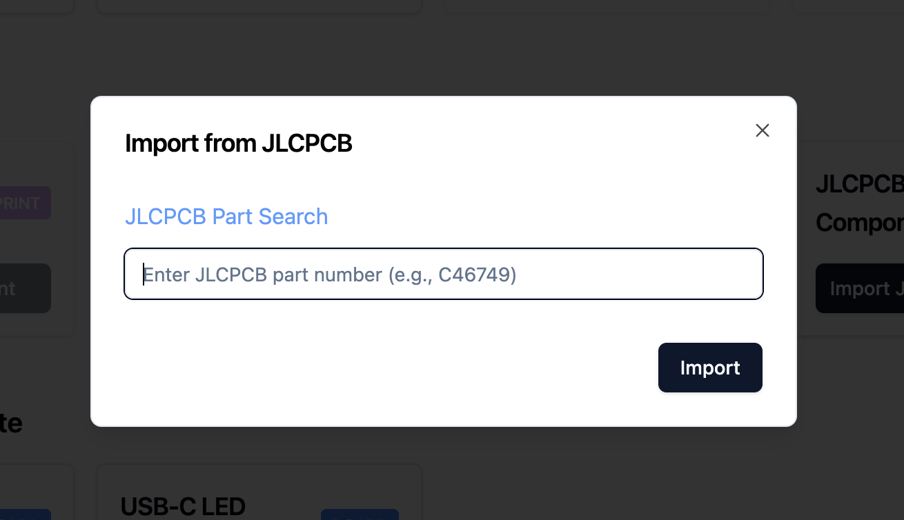 The easiest way to import JLCPCB components is using the editor's built-in import dialog when running tsci dev. This provides a modern search interface with real-time stock information.